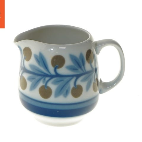 Denne flødekande er lavet af porcelæn og har en elegant hvid farve med gyldne kanter og en rød detalje rundt om kanten. Kanden har en kapasitet til at hælde væske, sandsynligvis fløde, med sin næbformede tud. Den har et gribende håndtag på sin ene side. Den måler 7 cm i størrelse.