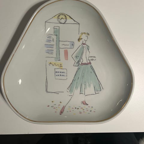 Denne trekantede porcelænsskål har en diameter på 17 cm. Skålen er dekoreret med et motiv af fugle i flugt over et landskab med planter og bjerge. Der er en tynd guldkant langs skålens kant. På bagsiden findes et fabrikationsstempel fra Oscar Schlegelmilch samt teksten 'Import 22'. Skålen er lavet i en klassisk porcelænsstil med glat, blank overflade.