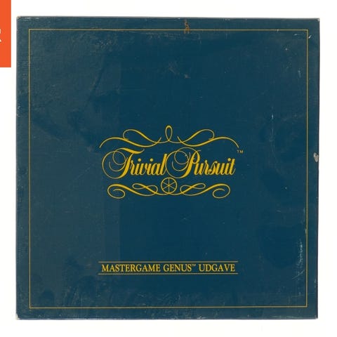 Dette er et brætspil af Trivial Pursuit, Mastergame Genus udgave, pakket i en blå æske med gule bogstaver. Det inkluderer spillestykker, terninger og kort til at spille spillet. Æsken viser tydelige tegn på brug med slid på kanterne. Spillet er på dansk.