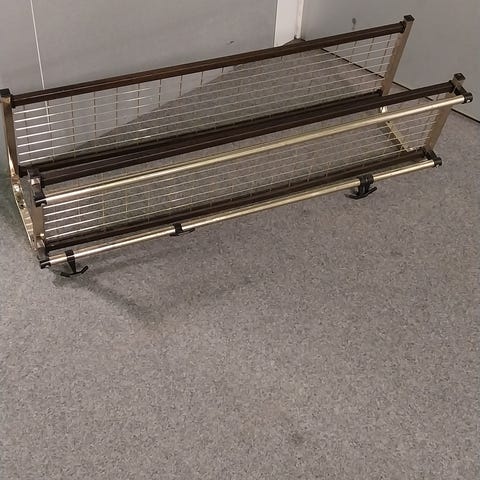 Svensk retro hattehylde knagerække fra 60-70 er'ne sort metal krom har diverse aldersrelateret brugsspor ridser og skramer l 147 d 28 h 28 .