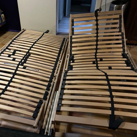 2 elevationssenge på bøgemeder. 90 x 200 cm. Med mindre brugsspor. Står i rygerhjem.