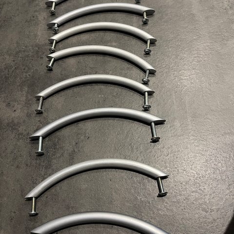 Længde 9,5 cm. Højde 1,5 cm. Afstand mellem hullerne 6,4 cm. Sælges samlet.