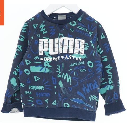 En blå sweatshirt med lange ærmer til børn. Den har hvide striber langs ærmerne og et stort hvidt Puma-logo på forsiden. Sweatshirten har en rund halsudskæring med knaplukning.