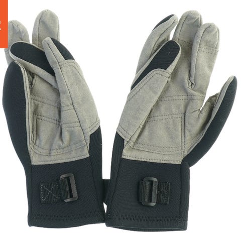 Et par dykkerhandsker i sort og gråt neopren med forstærkning på håndfladen. Handskerne har velcro lukning om håndled.