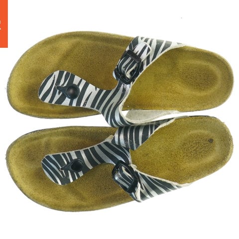 Brugte, brune to-strops sandaler til kvinder med regulerbare spænder og en mørk base. Sandalerne har en korklignende mellemsål og en sort rillet ydersål. Der er nogle slidspor og brugstegn, men de er generelt i god stand.