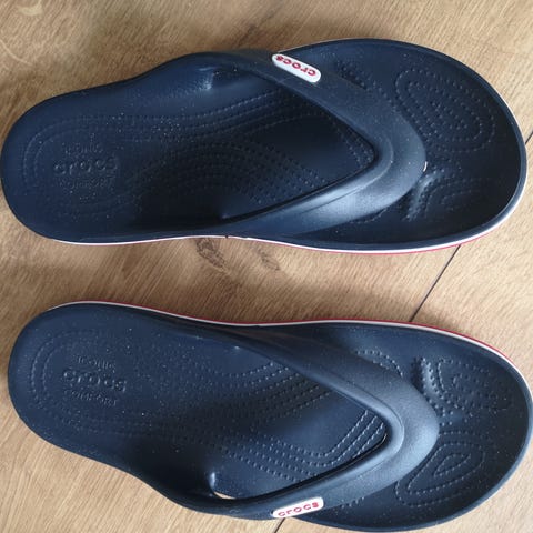 Klipklapper fra Crocs med pink fodseng og sorte remme. Sålen har et mønstret design for komfort. Størrelsen er 40.
