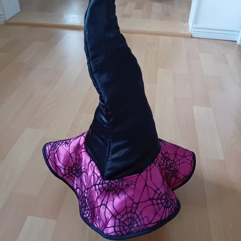 Denne hekselignende hat har et unikt design med et edderkop-neth mønster. Den er lavet af orange stof udvendigt og har en lilla inderside. Hatten er spids og rynket, hvilket giver den et karakteristisk udseende. Størrelsen er 43 cm.