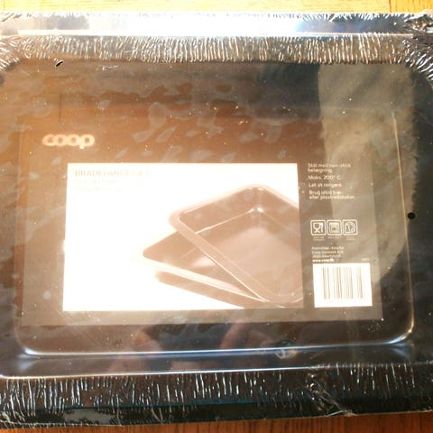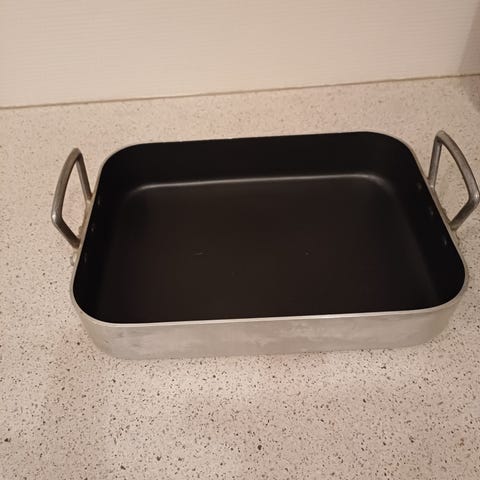 Brugt metalbradepande med mørk overfladebehandling og spor af brug. Bradepanden har afrundede hjørner og en tilspidset kant hele vejen rundt. Overfladen viser tegn på indbagte rester og misfarvning efter brug.