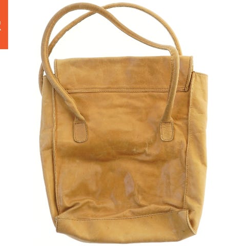 Tote taske fremstillet af en kombination af grå stof og brunt læder. Tasken har to stropper og en stor hovedåbning uden lynlåslukning, men med en indvendig lomme. På den ene side af læderdelene er der en pyntesnor med perler.