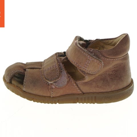 Brune sandaler til børn i størrelse 25 med en rem over vristen og åben tå-design. Skoene har en solid sål, der viser tegn på almindelig brug. Sandalerne er lavet af læder og har velcrolukning for nem justering og komfort.