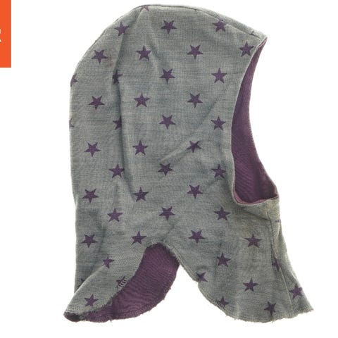 Børnehue i en brun farve. Den er lavet af blødt stof og har en form der dækker hele hovedet. Den er velegnet til at holde barnet varmt. Størrelsen er 92.