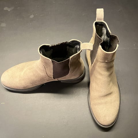 Støvlen er sort og fremstillet i skindmateriale. Den har en spids tå og en lav blokhæl. Elastiske paneler på siden gør det lettere at tage støvlen på og af. Bagsiden har en lille strop for nem håndtering. Størrelsen er 37.