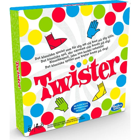 Kassen indeholder Twister spillet, der består af en stor plastikmåtte med farvede cirkler og en spinner med instruktioner. Spillet bringer folk sammen ved at udfordre deres balance og fleksibilitet ved at placere deres hænder og fødder på bestemte farvede cirkler i henhold til spinnerens angivelser. Velegnet til spillere over 6 år.