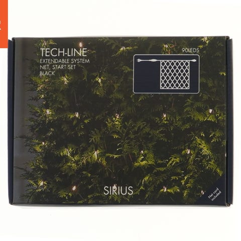 Sirius Tech-Line er en udvidelig lyskæde net, der måler 1,2 x 1,2 meter og har 90 LED lys. ledning i nettet er sort.