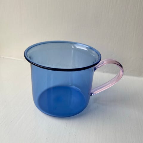 Denne keramikkop har en diameter på 9 cm og en blågrå farve. Den har en enkel rund form med en robust håndtag. Bunden har en prislabel, der angiver en tidligere udsalgspris. Koppen har nogle mærker på håndtaget, som kan tyde på brug. Tags: kop, keramisk, køkken, blå.