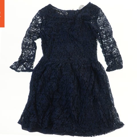 En kjole i rød med blomsterblonde detaljer over hele kroppen. Den har korte ærmer og en rund halsudskæring. Kjolen har en lille åbning med en knaplukning bagpå.