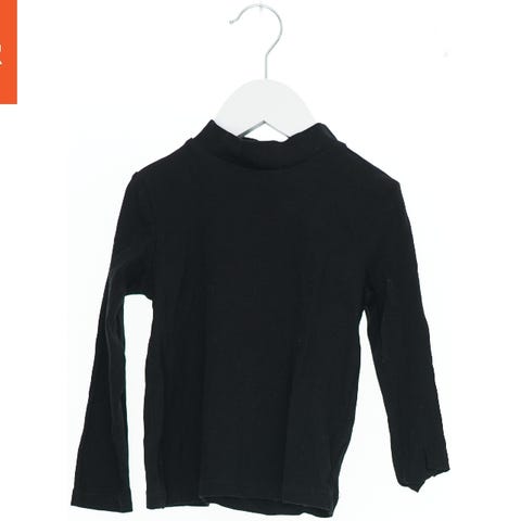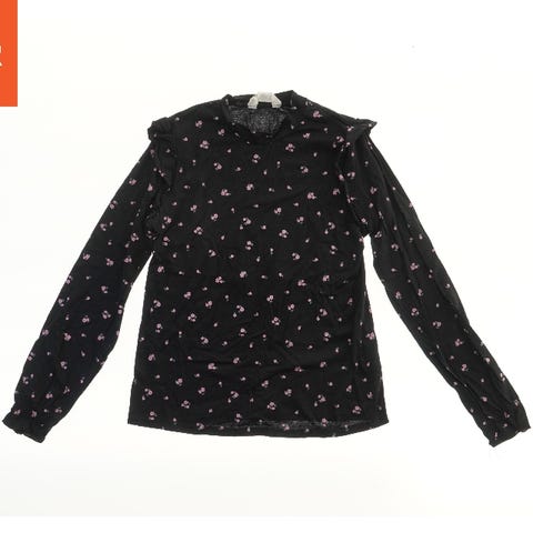 En sort bluse med lange ærmer og rund halsudskæring. Tøjet har en let bølget kant ved ærmerne og nederst. Blusen er lavet af et glat materiale.