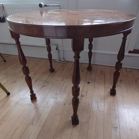 Har haft dette IKEA spisebord i mange år. Det er vældig slidt på overfladen og overfladen har ‘rejst sig’ nogle steder, eller er skaldet af. Det fungerer ellers fint, og der er stadig to tillægs plader så bordet kan være 140/180 eller 220 langt.