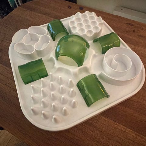 Aktivitets foder skål til mindre hunde. Tørfoder eller godbidder kan placeres og hundes kan så bruge energi og tid på at finde ud af hvordan den får maden/godbidderne. Måler ca 24 cm i diameter.
