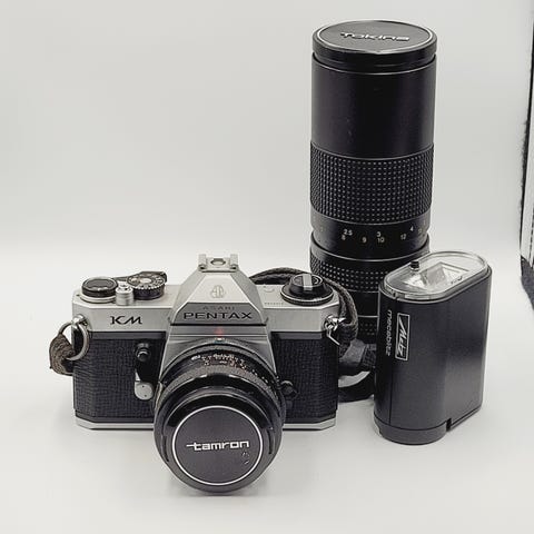 Pentax Analog Kamera. Kameraen er af analog type og inkluderer et objektiv samt en flash-enhed. Designet til brug med film, egnet til fotografering i forskellige situationer. Alt virker som det skal.