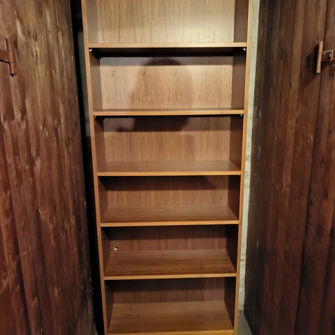 Reol i olieret egefinér med 12 rum i forskellige størrelser, hvoraf 3 af dem har låger med knobgreb. 60,5 cm bred.