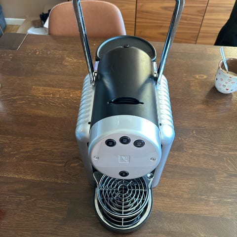 Nespresso pro kaffeautomat i sølv. Maskinen har en kompakt størrelse og et moderne design. Den er egnet til brug med Nespresso kaffekapsler, som medfølger