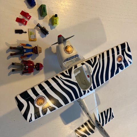 Safari legetøjssæt bestående af et orange og rødt fly med propeller og plads til figurer, samt en orange og sort jeep. Sættet inkluderer dyrefigurer som giraf, elefant, løve, bjørn og flodhest. Legetøjet er designet til børn og kan bruges til rolleleg og fantasifuld leg.