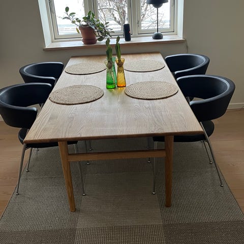 Fejlfri flotte spisebordsstole som er virkelig gode at sidde på. De er udført med sort læder og synlige stikninger. Vi sælger 4 stk grundet flytning. Prisen er for alle 4 stk.