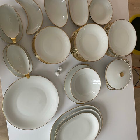 Stellet er hvidt med diskret gråt mønster og ægte guldkant, som giver et elegant og tidløst udtryk. Passer perfekt til både hverdag og festlige lejligheder.