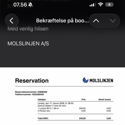 Sælges: Færgebillet til Molslinjen fredag den 9. januar klokken 20.30 fra Odden til Århus