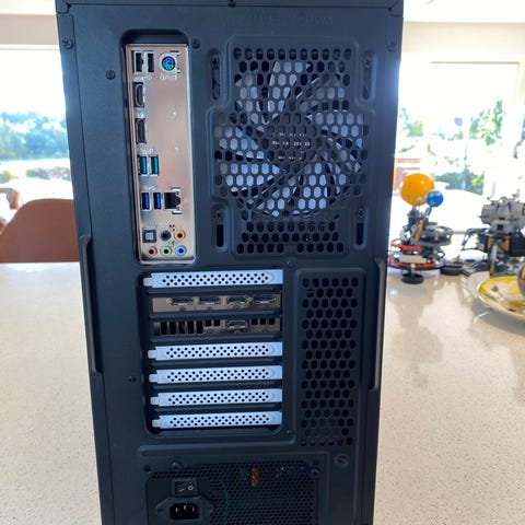 Vision Gaming Station computer med sort kabinet og rød detalje. Indeholder GeForce GTX grafikkort og CW550 strømforsyning. Designet til gaming med fokus på ydeevne og visuel kvalitet.
