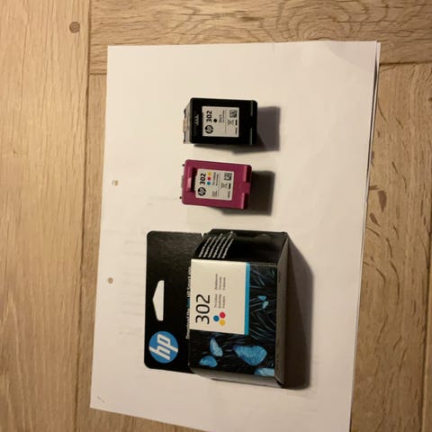 Min printer virker ikke længere. Derfor har jeg følgende blækpatroner til salg. 1 stk HP 302, farve, 4 ml og i uåbnet æske. Endvidere 2 næsten ikke brugte: 1 stk. sort HP 302 - 3,5 ml og stk. farve, HP 302, 4 ml. Jeg har købt en ny HP printer, hvortil der skal bruges HP305 blækpatroner. Derfor kan jeg ikke bruge de pågældende patroner. Se billede af faktura af 30/9-2025 vedr. købet af de 2 lettere brugte patroner. Den uåbne æske med HP 302 patron har jeg ingen faktura på, men udløbsdatoen er oktober 2026. Den samlede indkøbspris på de 3 patroner er kr. 473,- sælges for kr 250,.-.afhentet i Hjørring. Betaling kun kontant eller Mobil/Pay. Skriv en SMS eller ring tlf. 20843157.