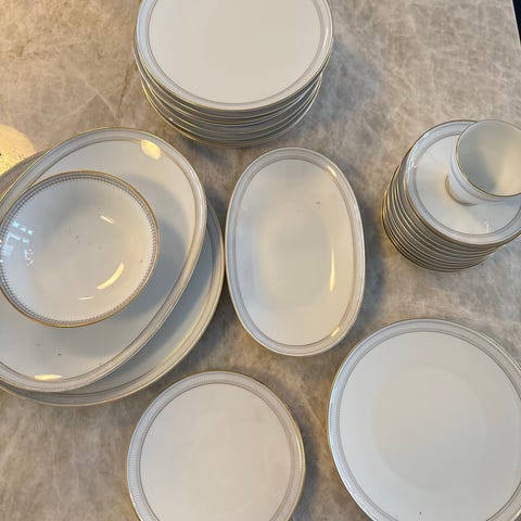 Hvidt porcelæn med diskret gråt mønster og ægte sølvkant, som giver et stilrent og tidløst udtryk. Perfekt til kaffebordet og pæne serveringer.