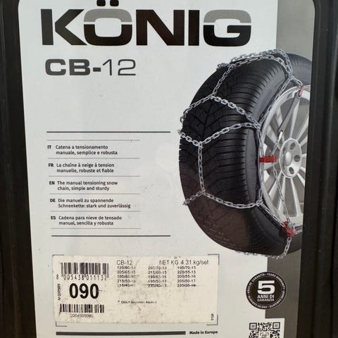 Volkswagen König CB-12 snekkæder i størrelse 097. Leveres i en sort opbevaringskasse. Snekkæderne er lavet af metal og designet til brug på biler for bedre vejgreb under vinterforhold.