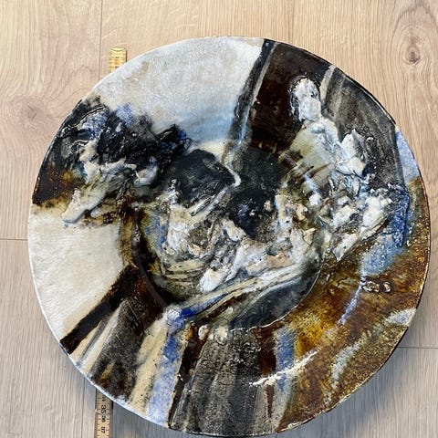 Keramisk dekorationsfad i rund form til ophængning med abstrakt farvet mønster i nuancer af hvid, brun og sort.