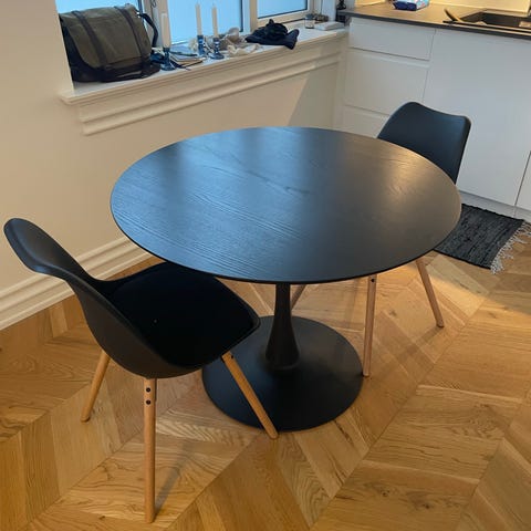 Fint spisebordssæt, som har stået i et køkken på et kontor. Brugt, men god stand.