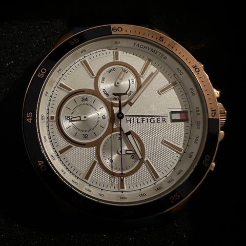 Blåt Tommy Hilfiger Kvinde ur med metalarmbånd og rund urskive. Uret har tre mindre skiver på urskiven og en kombination af sølv- og rosaguldfarvede detaljer. Det er købt ombord på Scandlines færgen. Det har stadig pris mærke på. Sælges da jeg fik 2 Hilfiger ure. Nypris er 1250,- som kan ses på det ene billede. Sælges for 999,-
