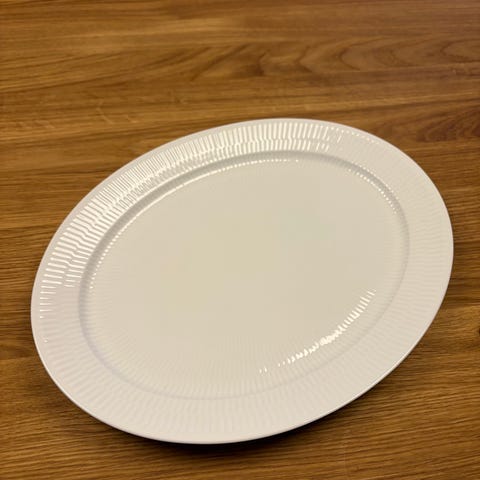 Royal Copenhagen serveringsfad i hvid riflet. Fadet er ovalt og måler cirka 35 cm i længden.