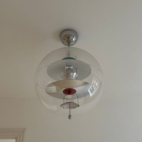 Verner Panton Globe pendel med kugleformet klar skærm og farvede indvendige elementer. Designet af Verner Panton, lampen er egnet til ophængning og skaber et dekorativt lys i rummet.