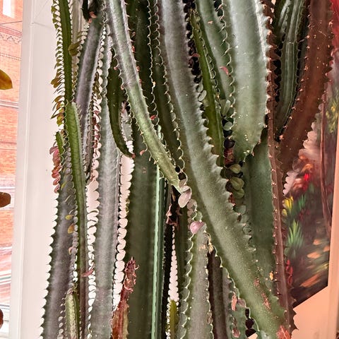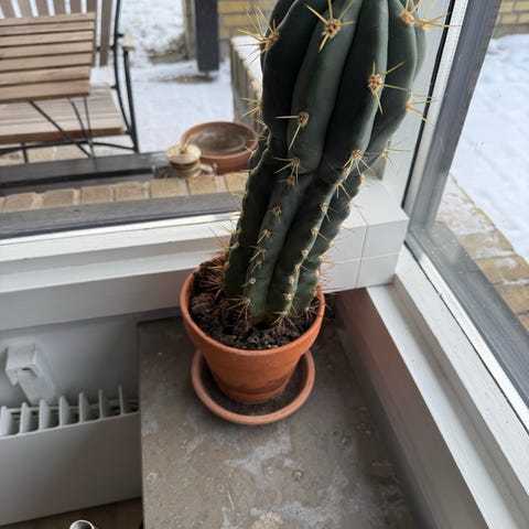 Stor kaktusplante placeret i en terracotta potte. Planten har flere opretstående stængler og er egnet til indendørs brug som dekorativ plante.