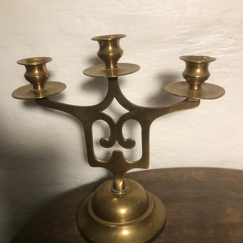 Smuk 3-armet lysestage / candelabra i massiv messing med en helt særlig ottekantet fod, rigt dekoreret med et elegant og detaljeret rosemønster. Lysestagen har plads til 3 stagelys / kronelys og er udstyret med fine messingdetaljer ved hver lysholder, der opsamler dryppende voks.