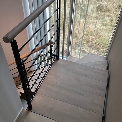 Indendørs kvartsvingstrappe med trætrin