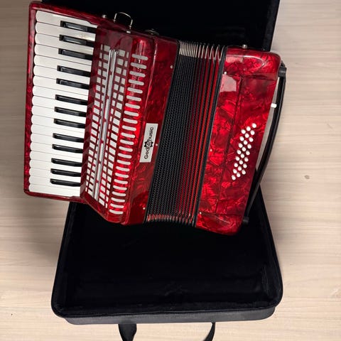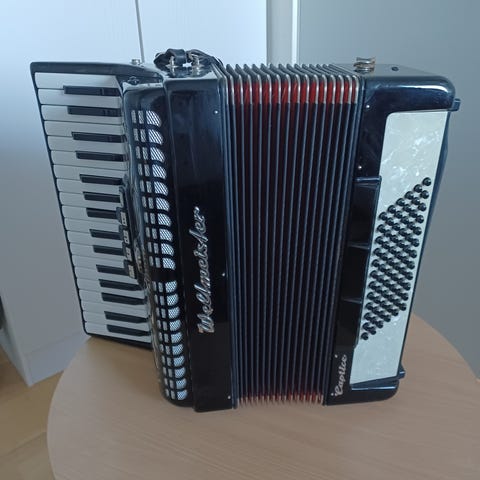 Flot Weltmeister Akkordeon (Harmonika) med 120 basser i perlemors rød. Instrumentet har både knapper og tangenter og leveres med bærerem. Passer til brug i musikalske sammenhænge til børn, hvor den er let at tage med.