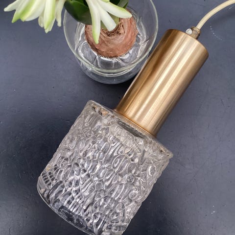 SMUKKESTE pendel i en lækker kombination af krystalglas og messingtop - den er tung.