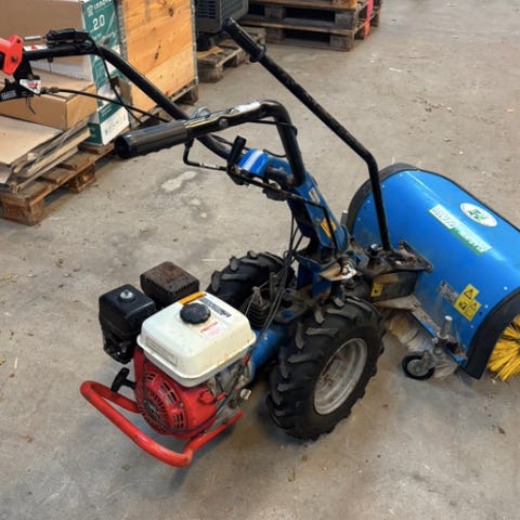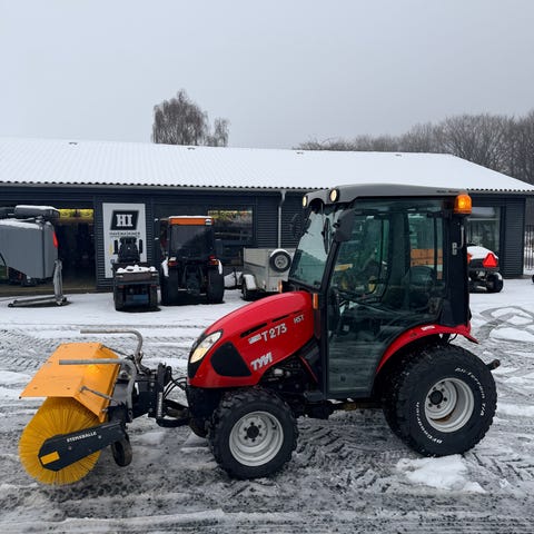 Mini TRAKTOR med kostmontering. Maskinen er udstyret med lukket førerhus og motor placeret for. Velegnet til mindre rengørings- og vedligeholdelsesopgaver, hvor kostefunktionen kan benyttes til at feje overflader.