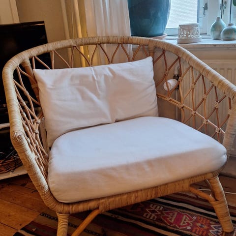 Ikea lænestol / loungestol i flet (rotting). Udgået model. Aldrig brugt, købt i sommer (2025). Modellen hedder "Stockholm 2017". Stand som ny. Sælges grundet flytning. Kun afhentning, prisen er ikke til forhandling.