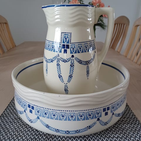 Porcelæn kande og skål med blå bladmønster. Sættet består af en kande med hank og en stor skål, begge dekoreret med et blåt bladmotiv langs kanten. Materialet er porcelæn, og designet er klassisk og enkelt. Engelsk. Ø 42 cm. 30 cm højt.