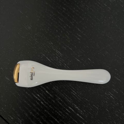 Ansigtsroller i grøn jade og hvid dermaroller. Ansigtsrolleren er lavet af grøn jade med metalbeslag, og dermarolleren har en hvid krop med små nåle til hudpleje.