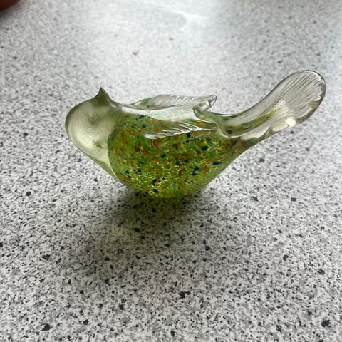 Glas fugl figur med grønne detaljer. Dekorativt objekt til indretning.