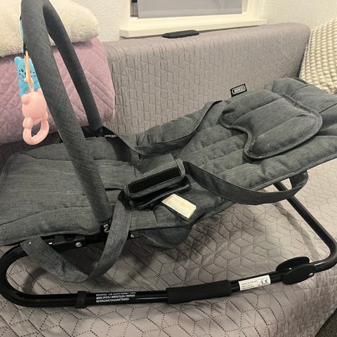 Den har indbyggede små højttalere øverst, der kan spille musik for den lille. Stolen kan både bruges som vippestol og indstilles til at stå stabilt.